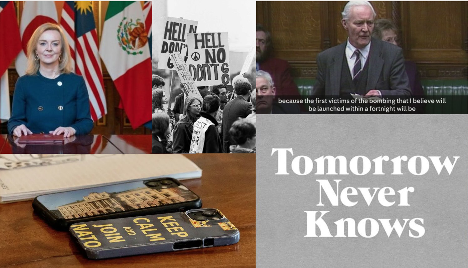 Images (cw): Liz Truss as Foreign Minister // Support Demonstration for draft resister Mike Leavy, at Seattle's Federal Building, September 13, 1968, photo by Fred Lonidier // Tony Benn makes his speech against the bombing of Iraq in 1998 // TNK logo by 3dperson // Swedish Foreign Minister Tobias Billström’s phones as pictured by Sydsvenskan.